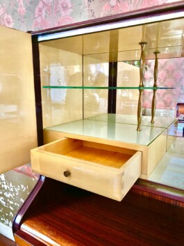 The sideboard features four finely crafted drawers, offering ample storage for dining essentials and a distinctive black drop-down door that reveals an additional storage compartment. One of its most remarkable feature is the high accordion-door system, which opens smoothly to reveal the bar cabinet. Inside, the bar section is elegantly finished in solid maple, enhanced by classic brass columns and glass elements that create a luxurious atmosphere.