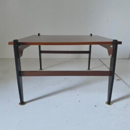 A beautifully crafted 1950s Scandinavian coffee table, showcasing the elegance and functional simplicity of Mid-Century Modern design. This piece seamlessly combines warm teak wood, sleek iron, and refined brass accents.