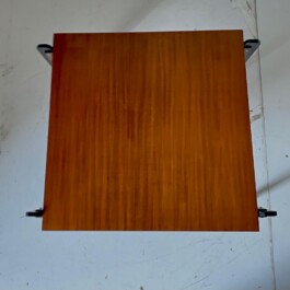 Teak wood tabletop with a rich, warm-toned wood with a smooth and Black-painted iron frame with elegant brass feet – providing an elegant contrast to the wooden top, adding stability and durability.