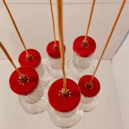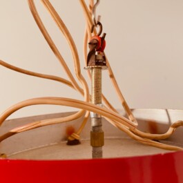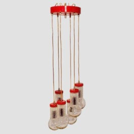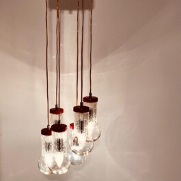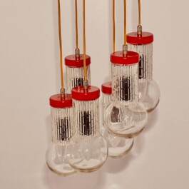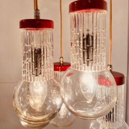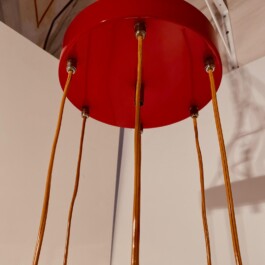 Vintage red five-light spot chandelier, attributed to the renowned Italian lighting manufacturer Stilnovo, dates back to the 1950s. The chandelier features five elegantly suspended lights, each encased in cut glass globes, which are connected to the central top plate by slender wires. The red hue of the light fixtures provides a bold and striking contrast to the translucent beauty of the glass, making this piece a standout addition to any interior.