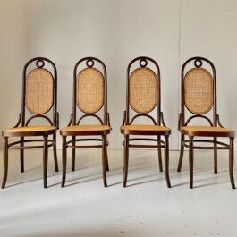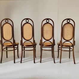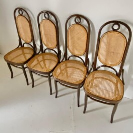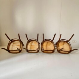 Elegant set of four bentwood beech wood chairs, produced by the renowned manufacturer Thonet, features the iconic Model 207, more commonly known as “Long John.”
