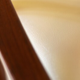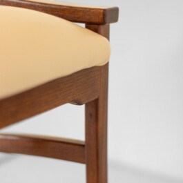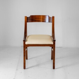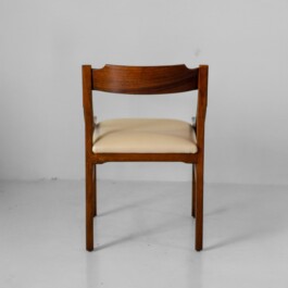 Each chair features a solid walnut wood frame with refined sculptural lines and with confortable beige coloured leatherette seats.