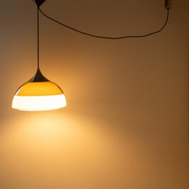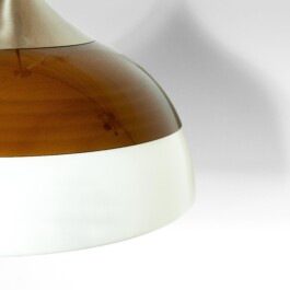 An unexpected chromatic accent revealed when the lamp is illuminated: a whiskey-coloured acrylic shade harmoniously combines with the white opaline glass, creating a captivating interplay of light.