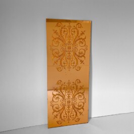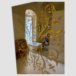 This rare 1960s Italian floor/wall mirror is a stunning example of mid-century craftsmanship, featuring a finely decorated yellow-tinted glass with intricate detailing embedded within the glass itself. The original glass surface remains intact, showcasing beautiful oxidation marks that enhance its vintage charm and authenticity.