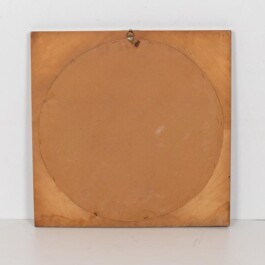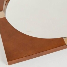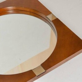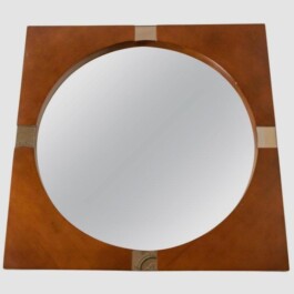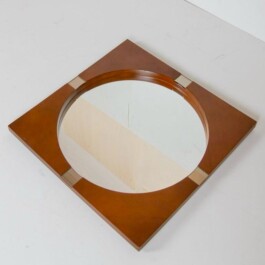 Unusually shaped vintage wall mirror features a square-shaped teak wood frame with iron details surrounding a round glass center. Produced in the 1960s, a period marked by a focus on clean lines, natural materials, and functional elegance. The teak wood frame, known for its warmth and durability, perfectly complements the delicate iron accents, offering a harmonious balance among the different items materials.