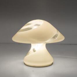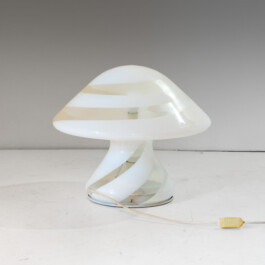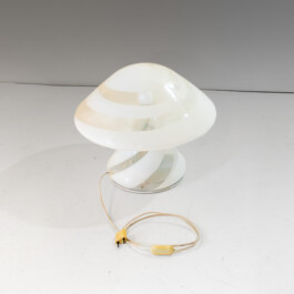 The lamp is crafted from a single, seamless piece of opaline Murano glass, featuring the sophisticated “swirl” technique. Translucent and milky-white spiral stripes wrap elegantly around the organic, fungal silhouette, creating a mesmerizing visual rhythm.
