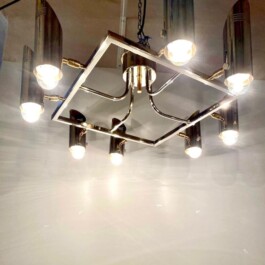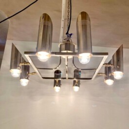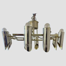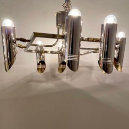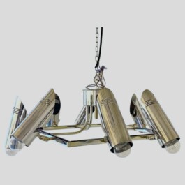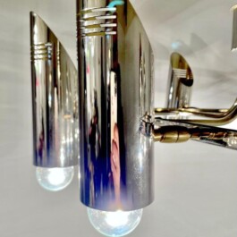 This rare and exquisite multi lights ceiling lamp, designed and manufactured in Italy during the 1970s. Crafted in chromed solid brass, it features eight fully adjustable spotlights that can be oriented in any direction, offering exceptional versatility and functionality.