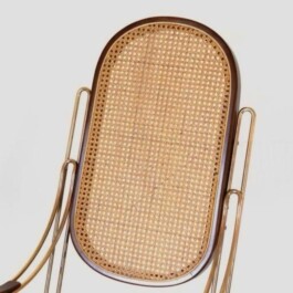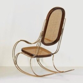 The combination of brass and natural wicker reflects a refined balance of materials, lending the piece a warm and sophisticated character. The gentle rocking motion and ergonomic shape make this chair a perfect addition to any space, whether used as a statement piece in a reading nook or as a stylish accent in a living room.