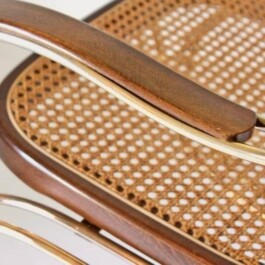 The graceful curves of the brass structure create a fluid, sculptural form that enhances both comfort and visual appeal. The seat and backrest are crafted from traditional Vienna wicker, meticulously woven to provide breathability and durability, while the seat is reinforced with a sturdy wood frame for additional support.