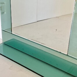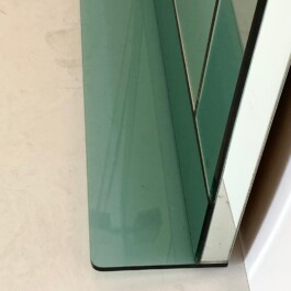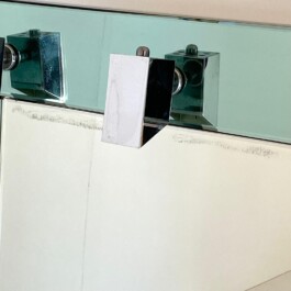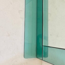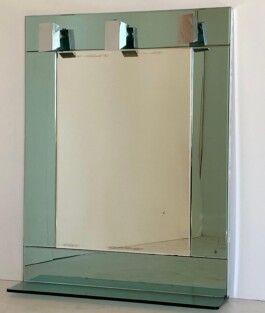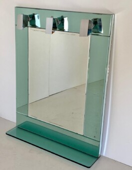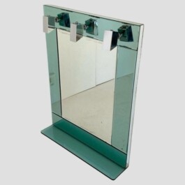 A sophisticated blend of functionality and design, this 1970s Italian vintage wall mirror features an elegant aqua glass mirror paired with three chrome lights spots, offering both style and illumination. A removable lower glass shelf adds versatility, making it a perfect addition to bathrooms or dressing areas.