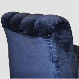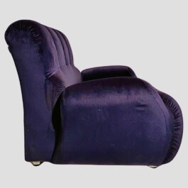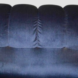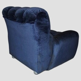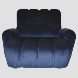 Defined by its soft yet sculptural lines, the piece offers both aesthetic refinement and superior comfort. The original deep blue velvet, with its rich texture and subtle sheen, enhances the chair’s luxurious appeal, while the chromed feet add a sleek, modern contrast.