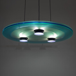 An Eighties refined design UFO perndant: the “Aurora” by Perry King and Santiago Miranda for Arteluce marries technical precision with theatrical presence.
