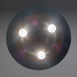 The lamp is made of a suspended disk formed by two textured glass plates sandwiching a carbon‑fiber core; three spots (halogen/LED compatible) provide both direct and diffused illumination, shaping depth and mood. The domed ceiling cap houses the transformer and three height‑adjustable suspension wires for precise installation.