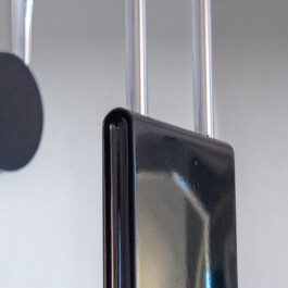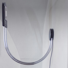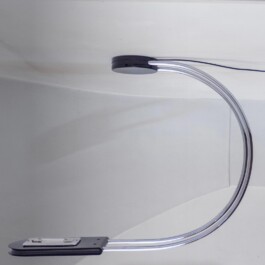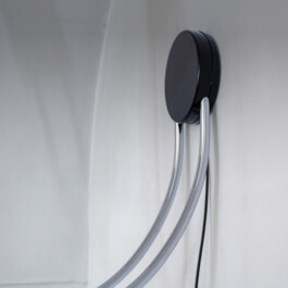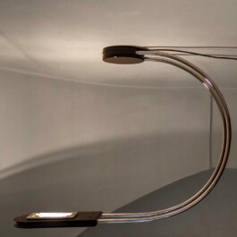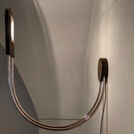 Chromed tubular frame with a black enameled metal shade, conceived to provide reflected, atmospheric light. An adjustable arm with right‑to‑left movement lets you aim the beam or craft refined chiaroscuro by changing the distance from the wall.