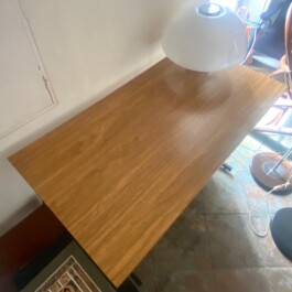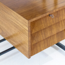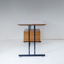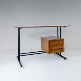 The architectural silhouette is framed by a sleek, black-lacquered tubular metall structure, supporting both the workspace and a floating drawer unit. This “airy” design creates a sophisticated visual tension between the minimalist metal frame and the rich, organic texture of the oak-effect surface. An orginal example of mid-century piece with balance of rationalist geometry and vintage warmth.