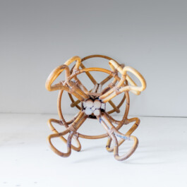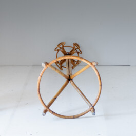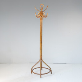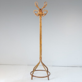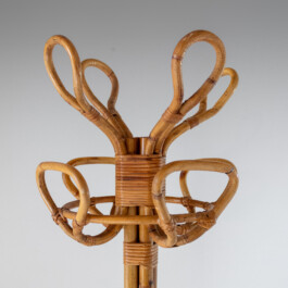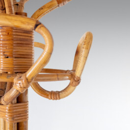 Tall tambour‑style central column, curved loop hooks for hats and coats, and a flared tripod base for stability and visual lightness. Crafted from natural materials — bamboo and wicker — and enriched by a gentle time patina.