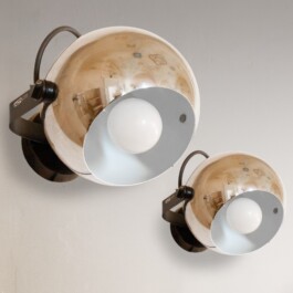 Refined pair of adjustable wall sconces / spotlights featuring an iconic Space Age design, produced in the 1970s by Alta Lite, the innovative spin-off of the renowned Italian firm Targetti Sankey.