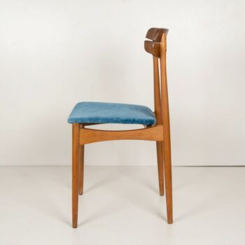 The chairs feature a bentwood construction for the seat, veneered in rich cherry wood, paired with a solid walnut frame that provides both elegance and durability. The finely refined bentwood structure, combined with the warmth of the walnut, creates a striking contrast while maintaining the comfort and sturdiness for which these pieces are known.
