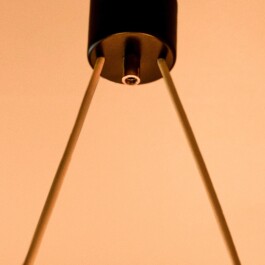 A striking pendant light by Stilnovo, crafted in Italy during the 1950s. This refined fixture features two cylindrical opaline glass shades, suspended from a sleek structure in polished brass and black enameled metal — a perfect expression of the era’s modernist elegance.