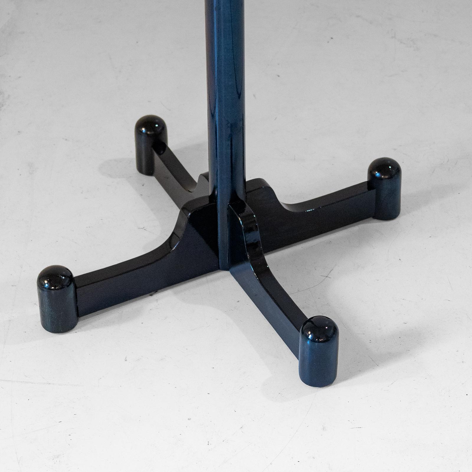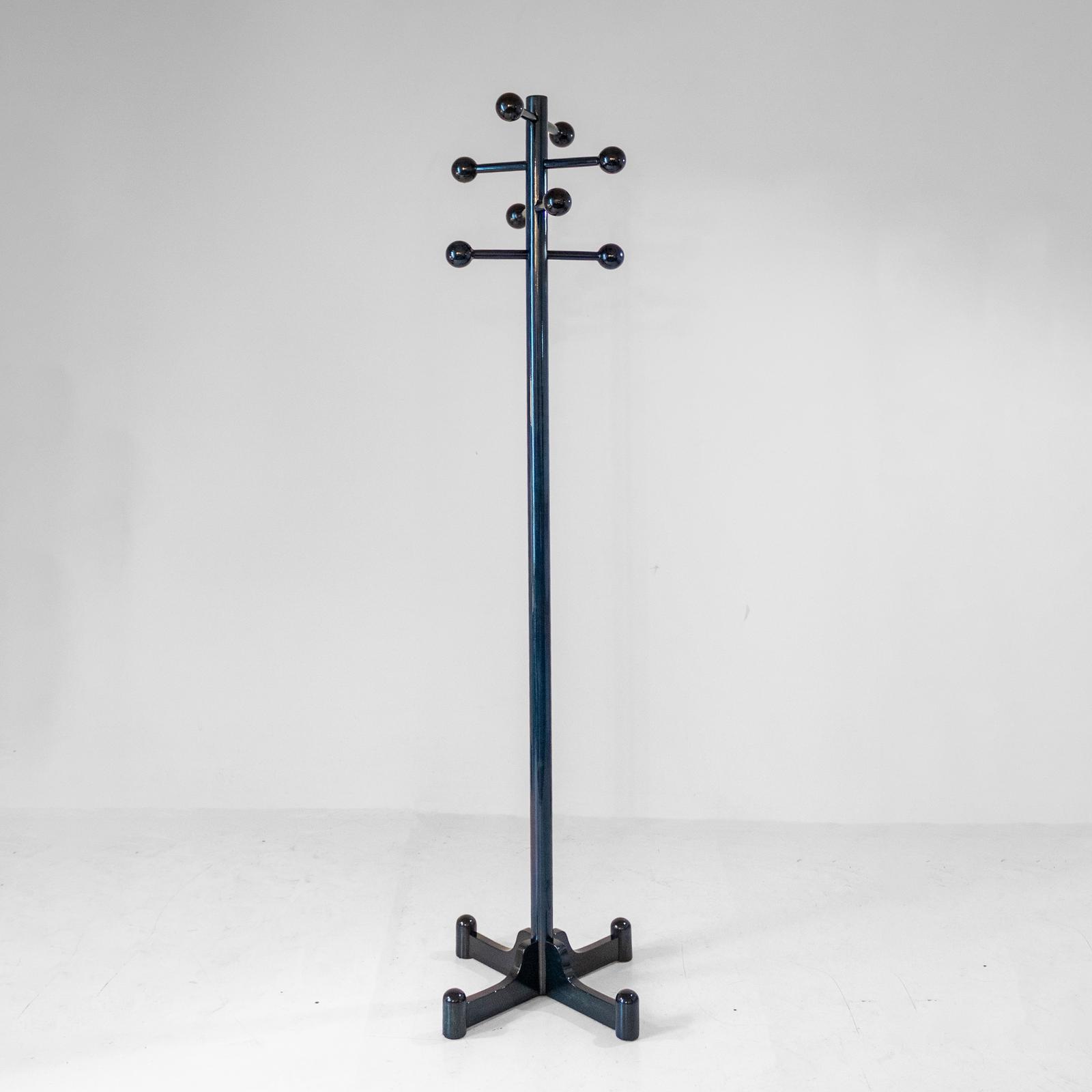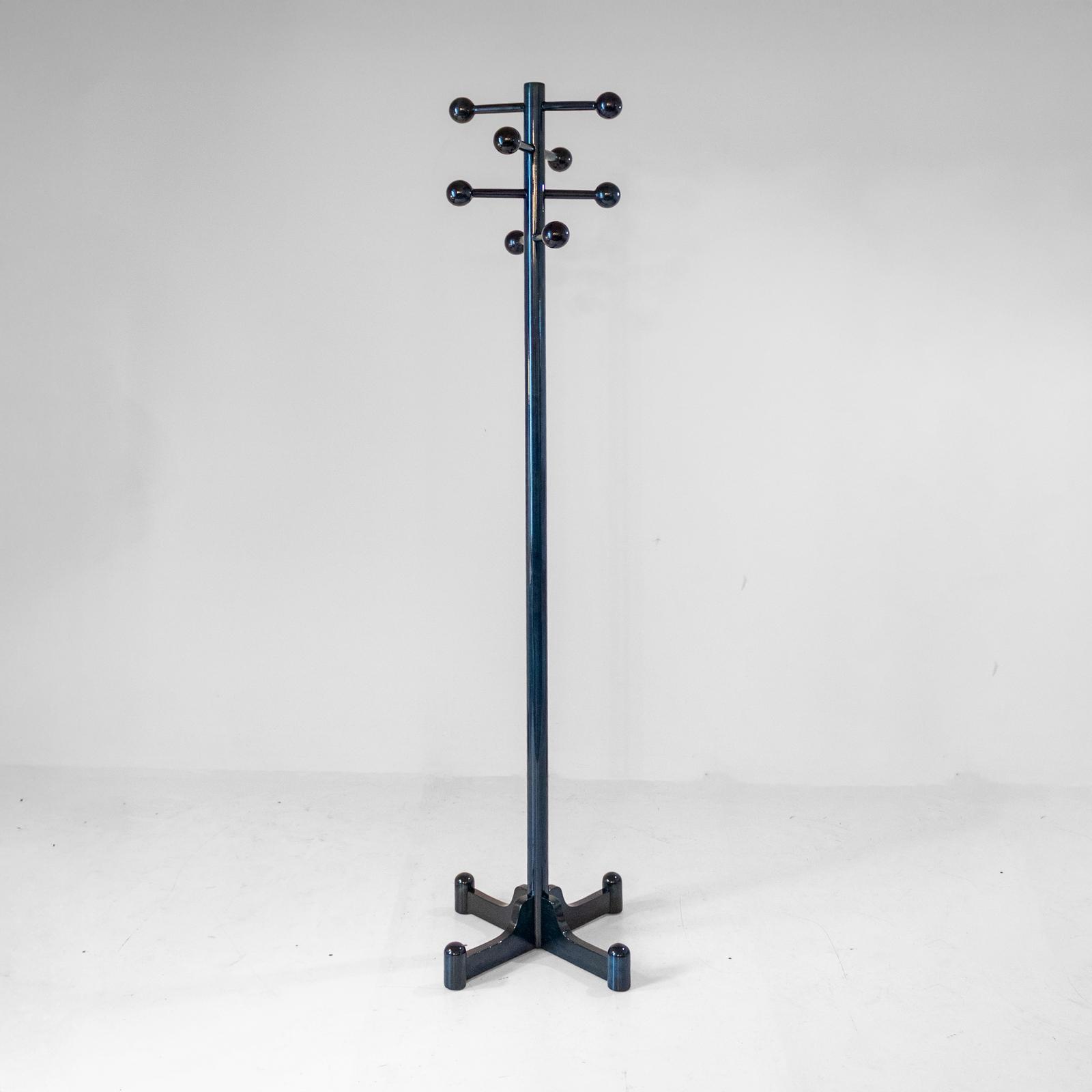 Italian modern coat rack dating from the 1970s, featuring a wooden structure finished with a high-gloss petrol green glaze.