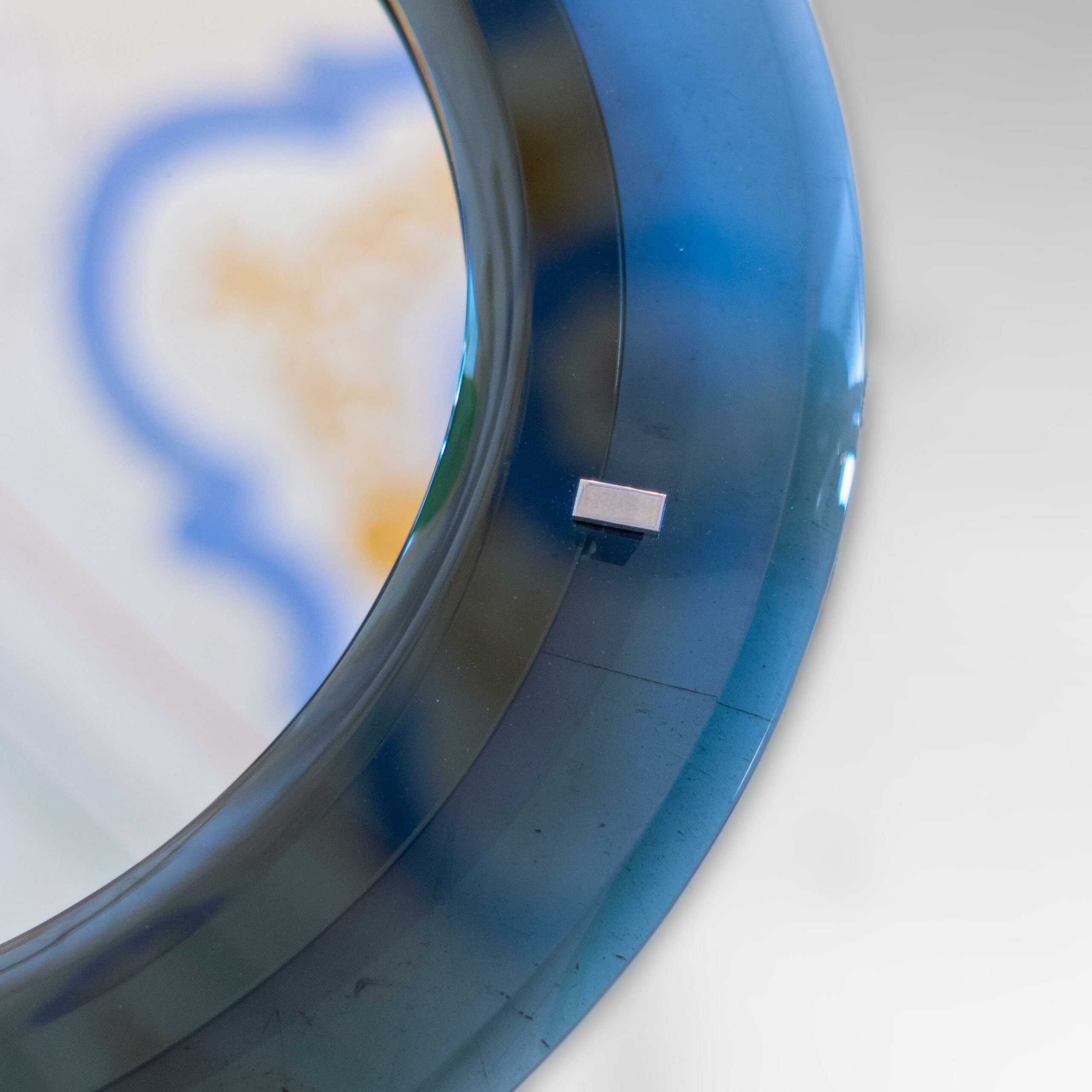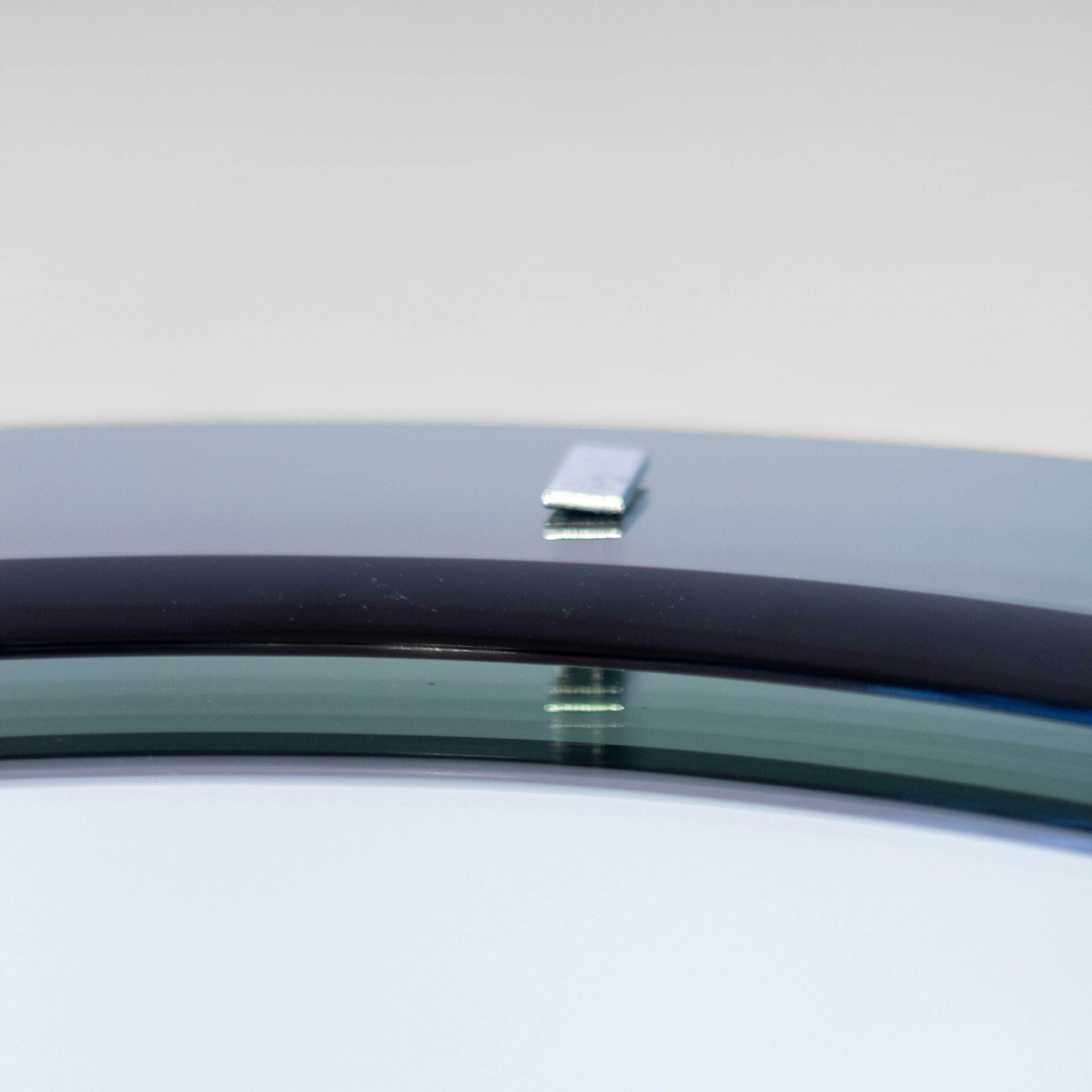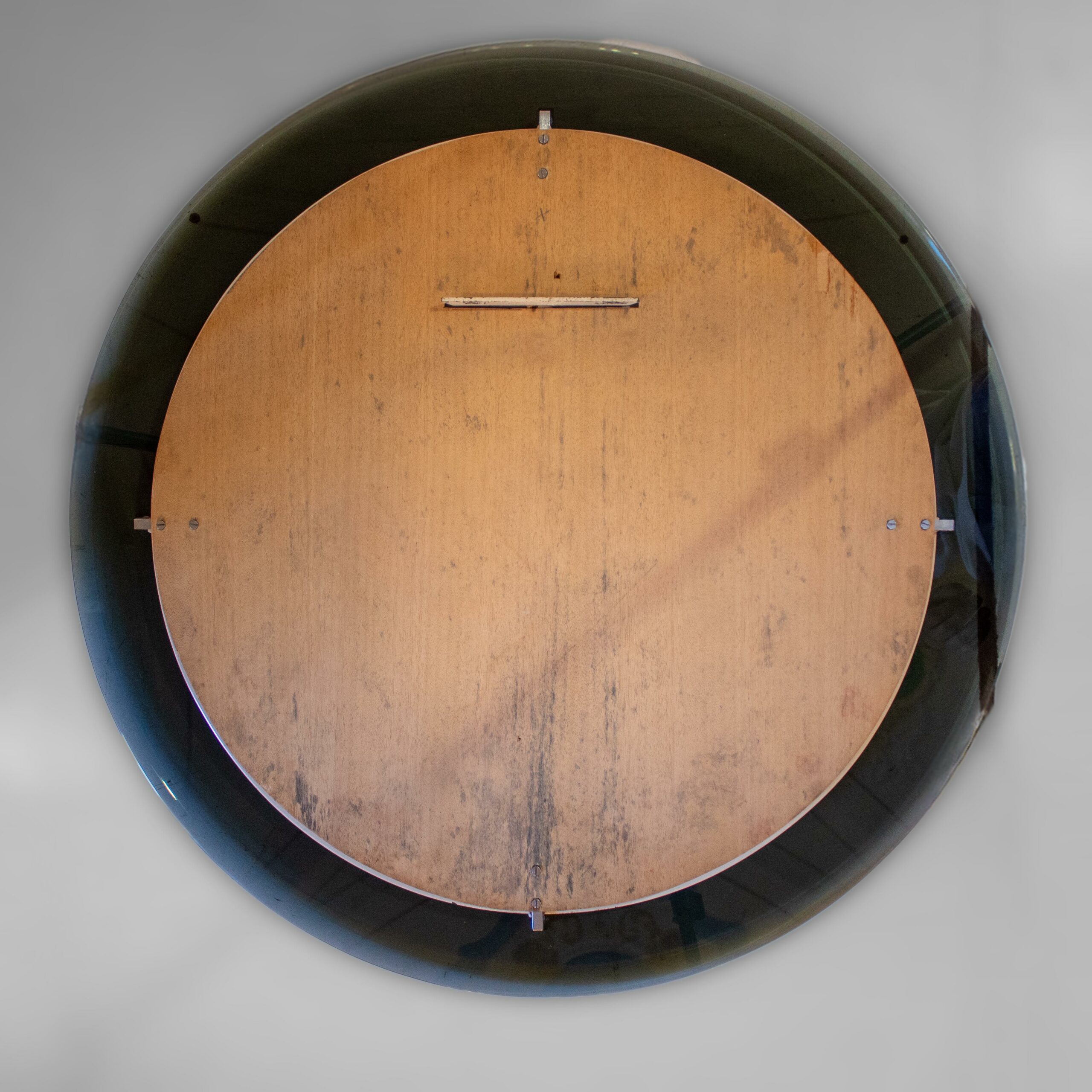 The central mirror is circular and finely beveled, creating a sense of depth and clarity. It is framed by a substantial smoked glass border nuances that shift with the light, a distinctive hallmark of Veca’s production.