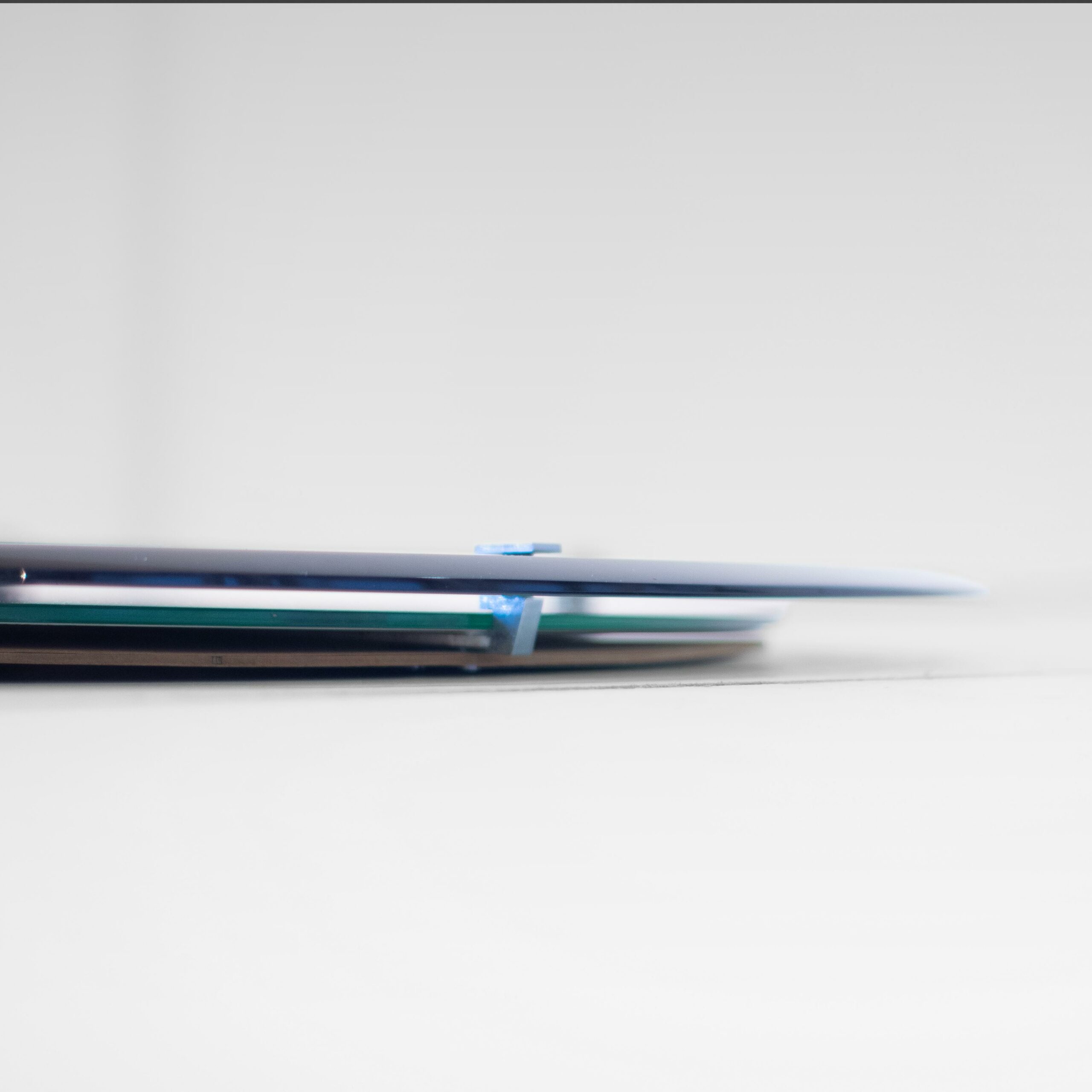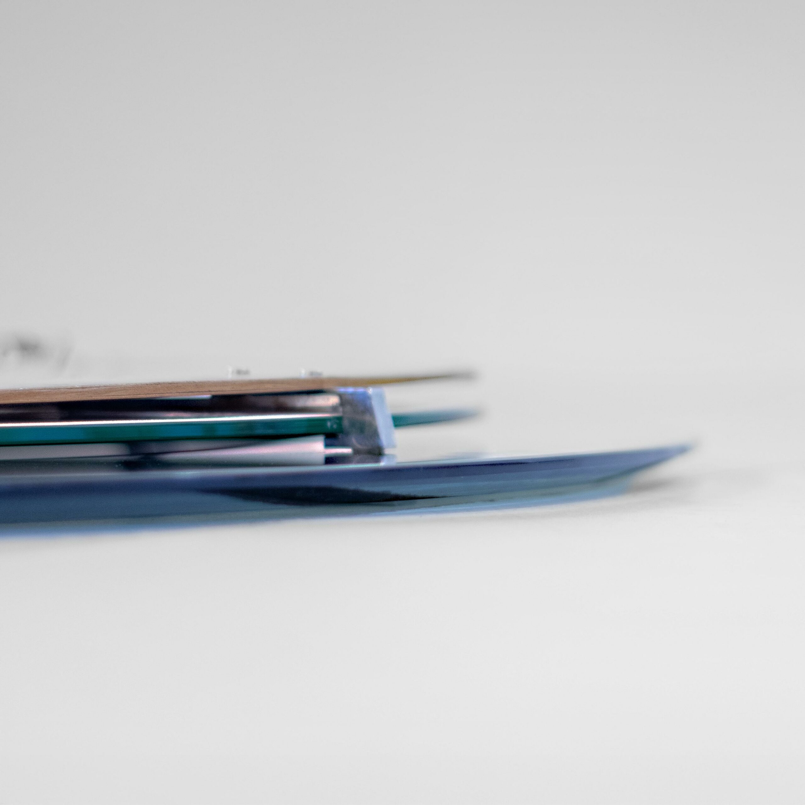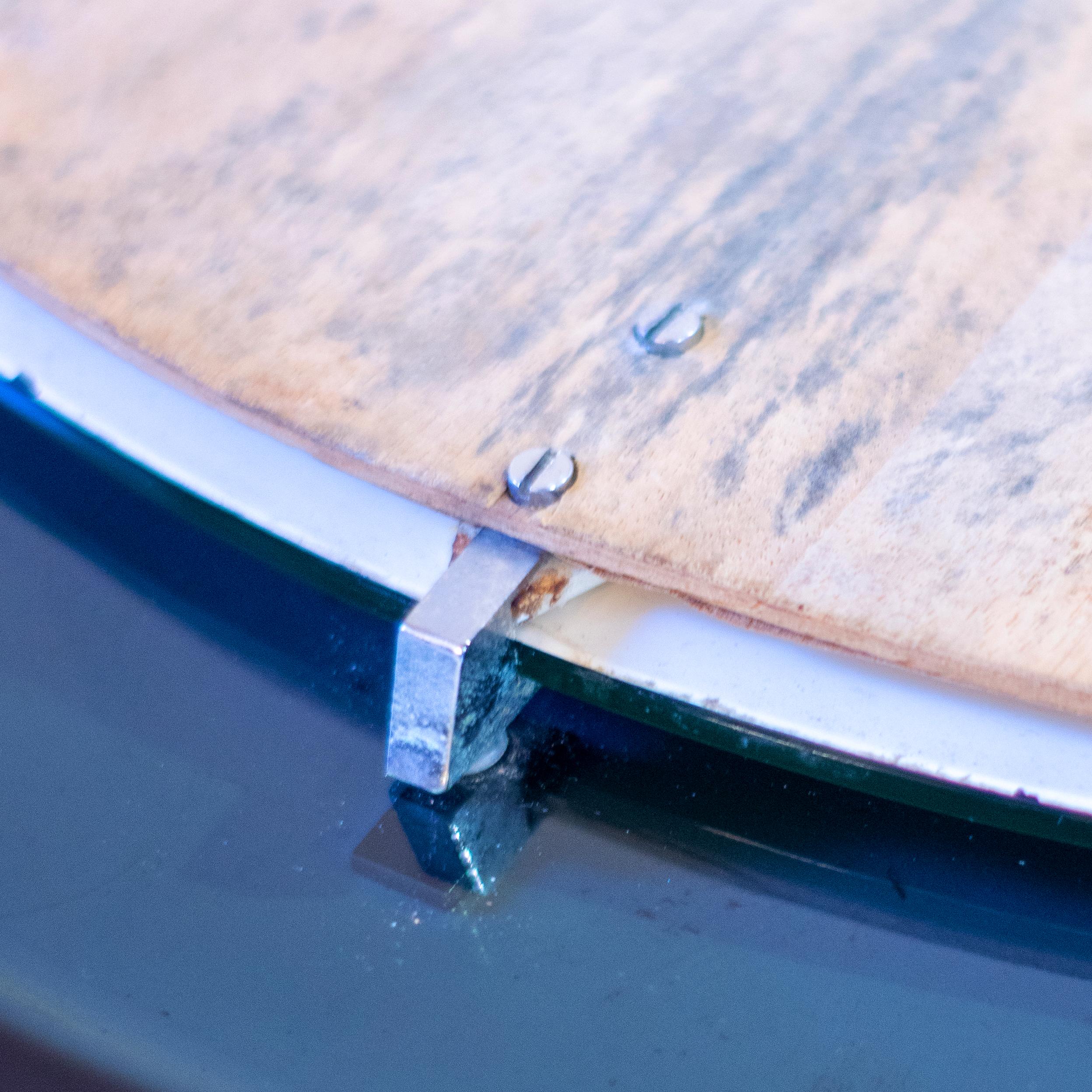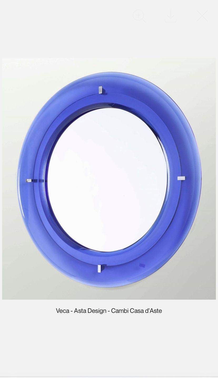 The central mirror is circular and finely beveled, creating a sense of depth and clarity. It is framed by a substantial smoked glass border nuances that shift with the light, a distinctive hallmark of Veca’s production.